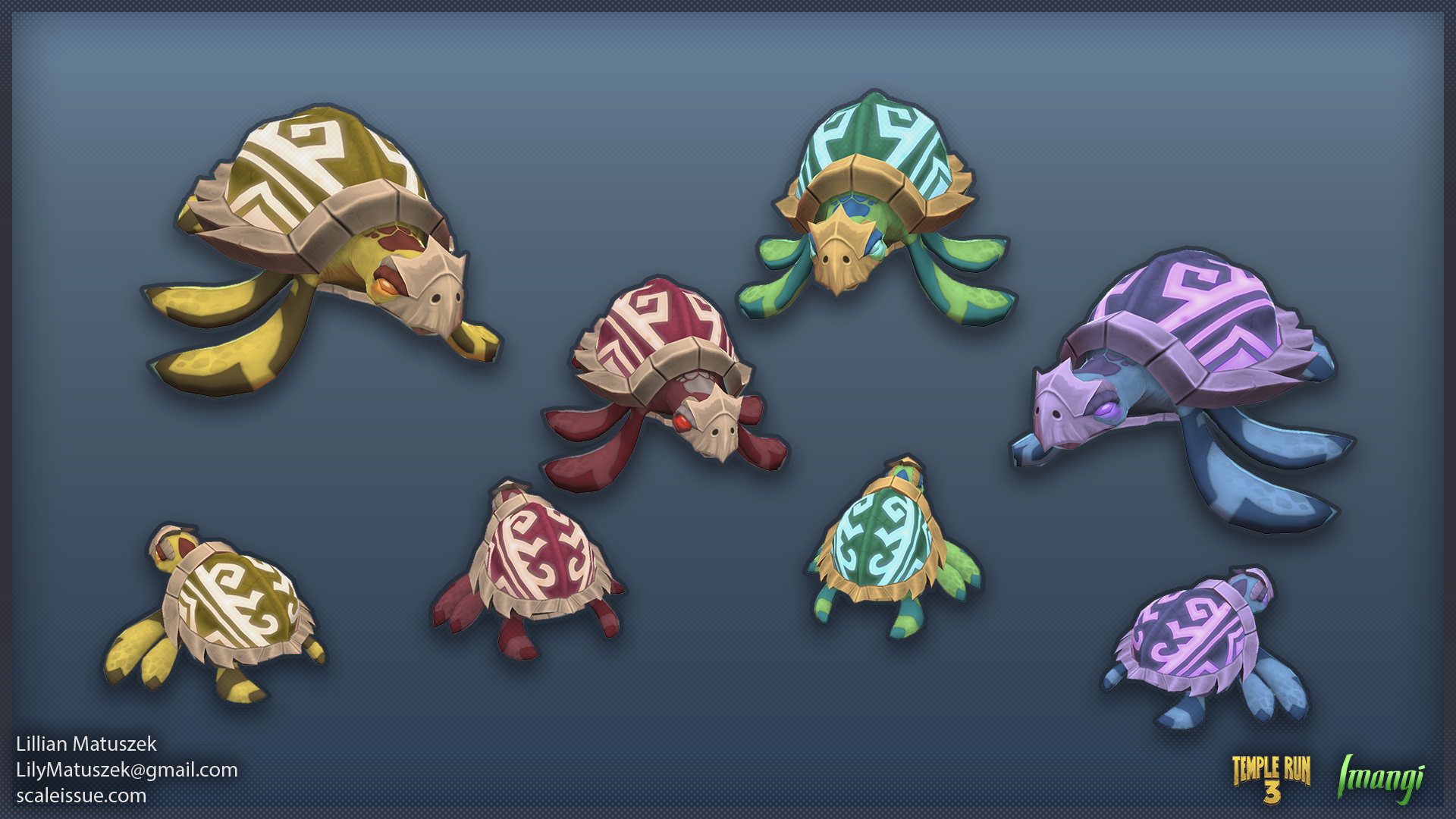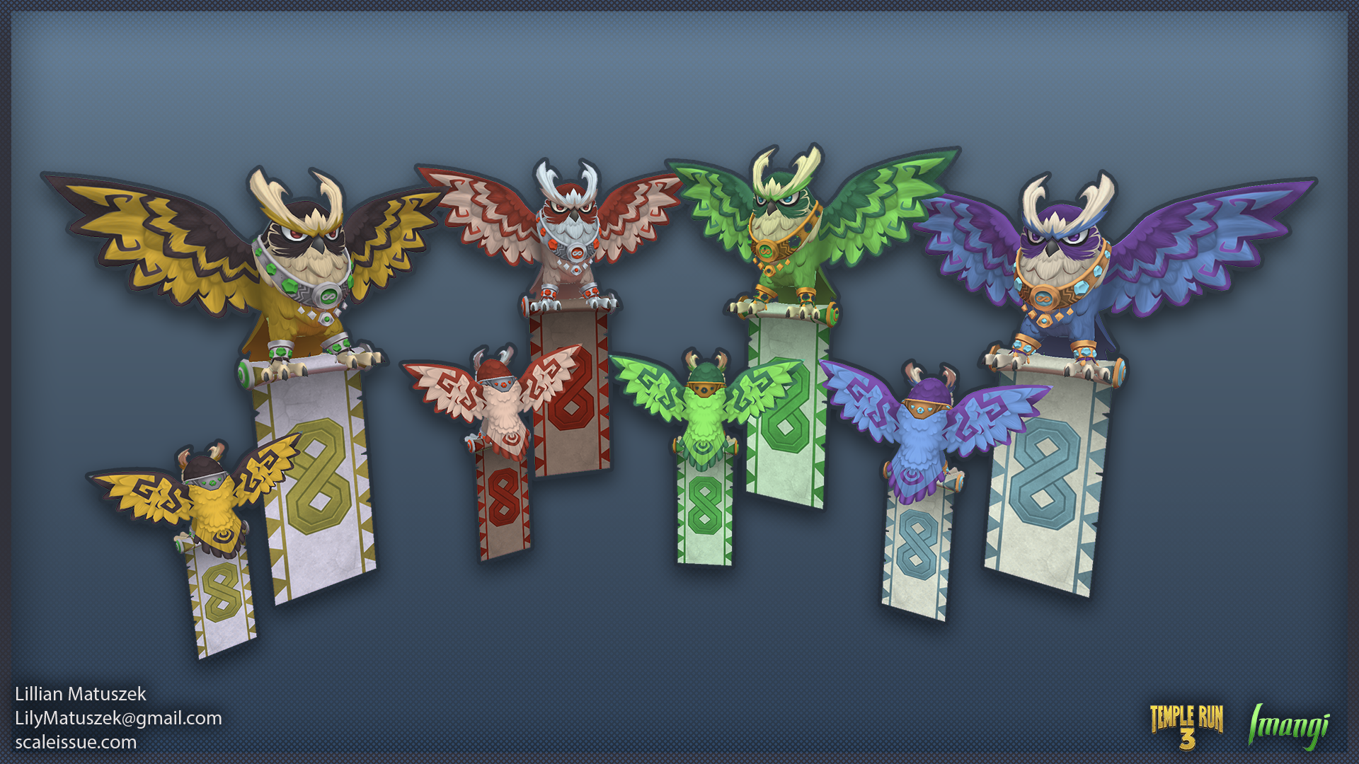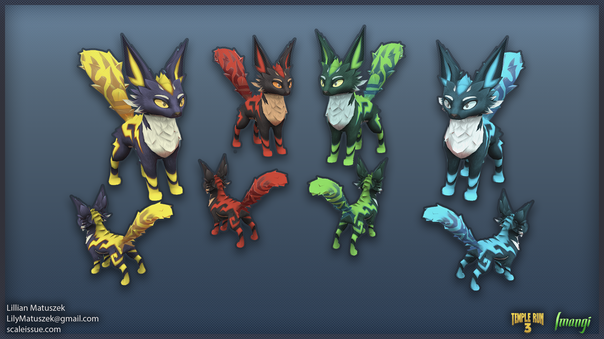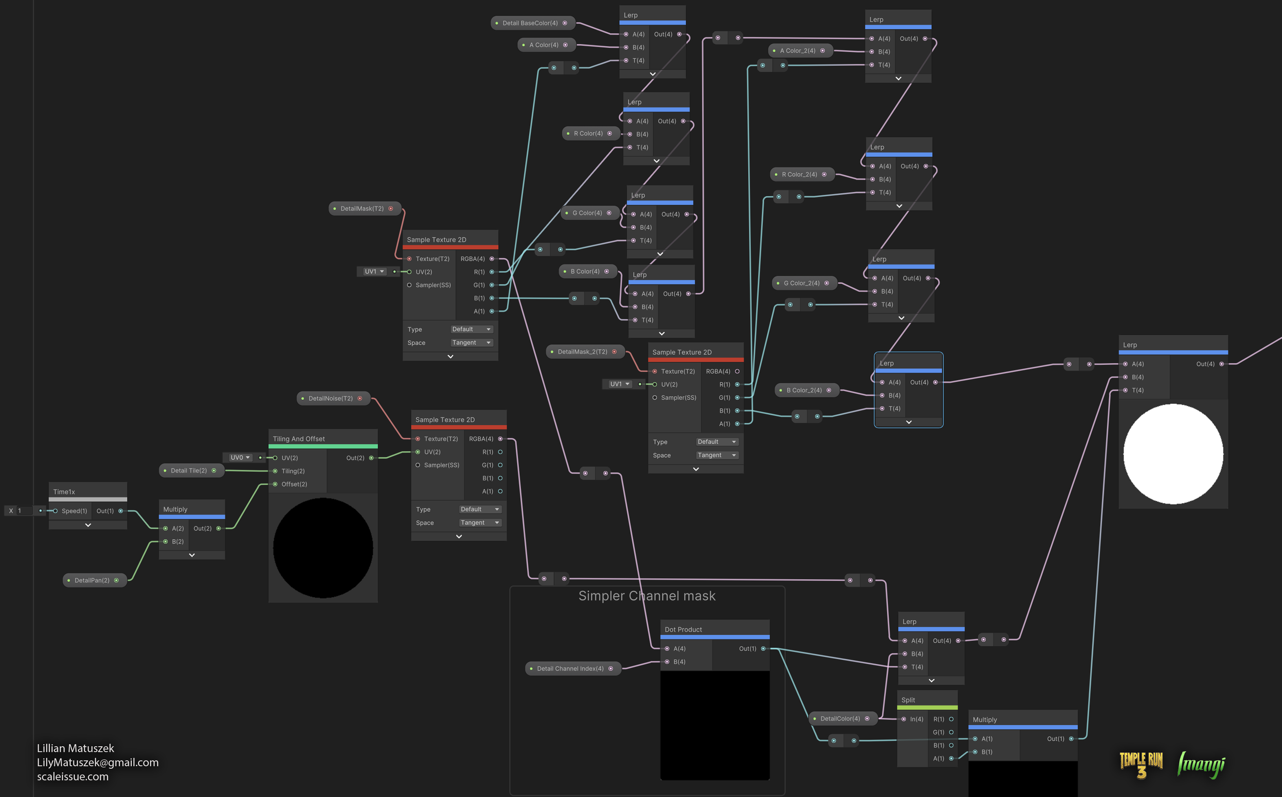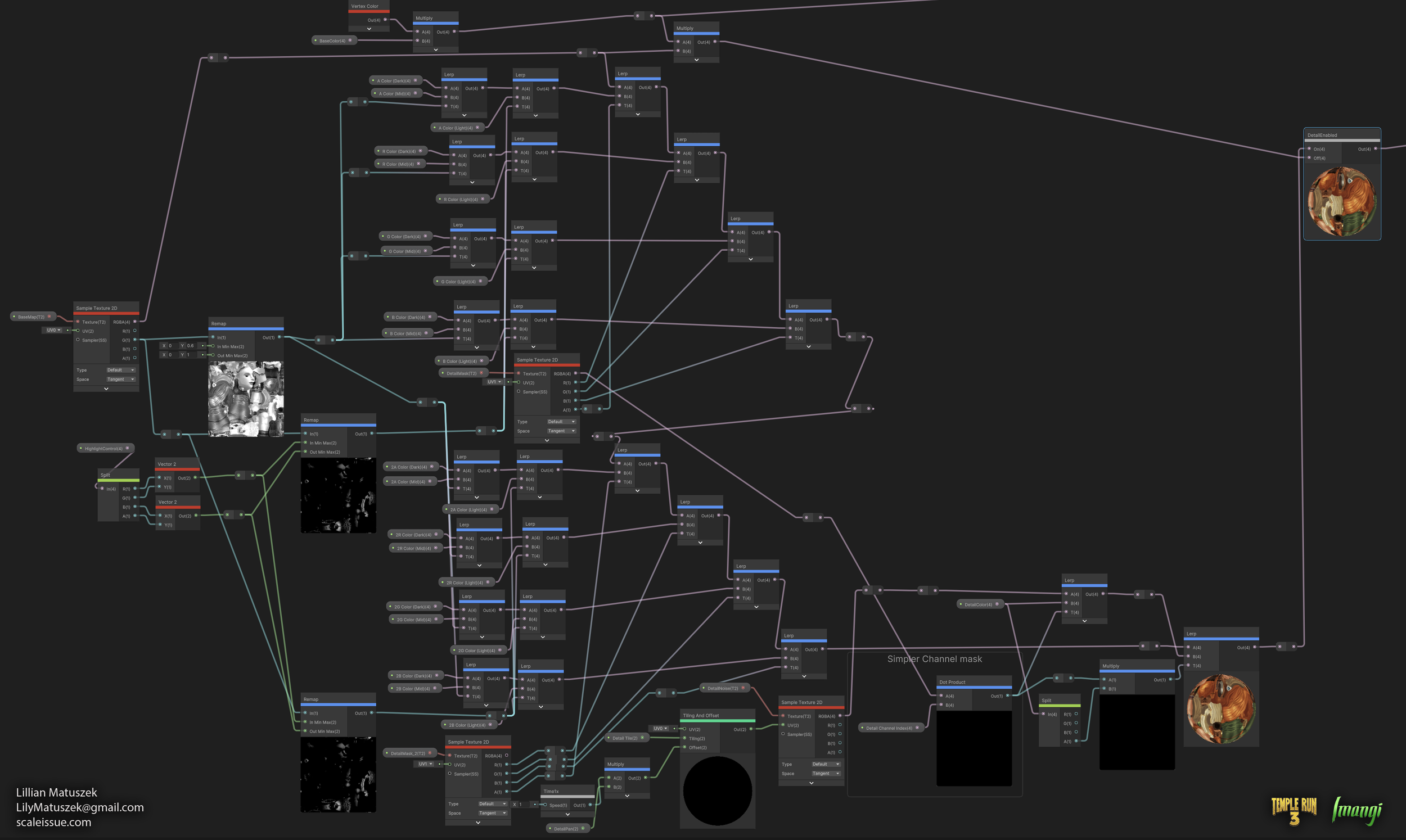 For Temple Run 3, I devised and implemented a RGBA texture masking node to allow characters and pets to have multiple, customizable color palettes. I demonstrated the method to an external team, which involves flagging specific layers inside a character’s Substance Painter file to also apply to the Red, Green, Blue, or Alpha channel of a texture. With this workflow, when the artists exported the character textures, it also exported the mask texture, which is used by the shader to add color to specific areas of the texture. This non-destructive approach allowed for the creation of alternate color palettes without needing to generate additional textures, which saved days of time per character.