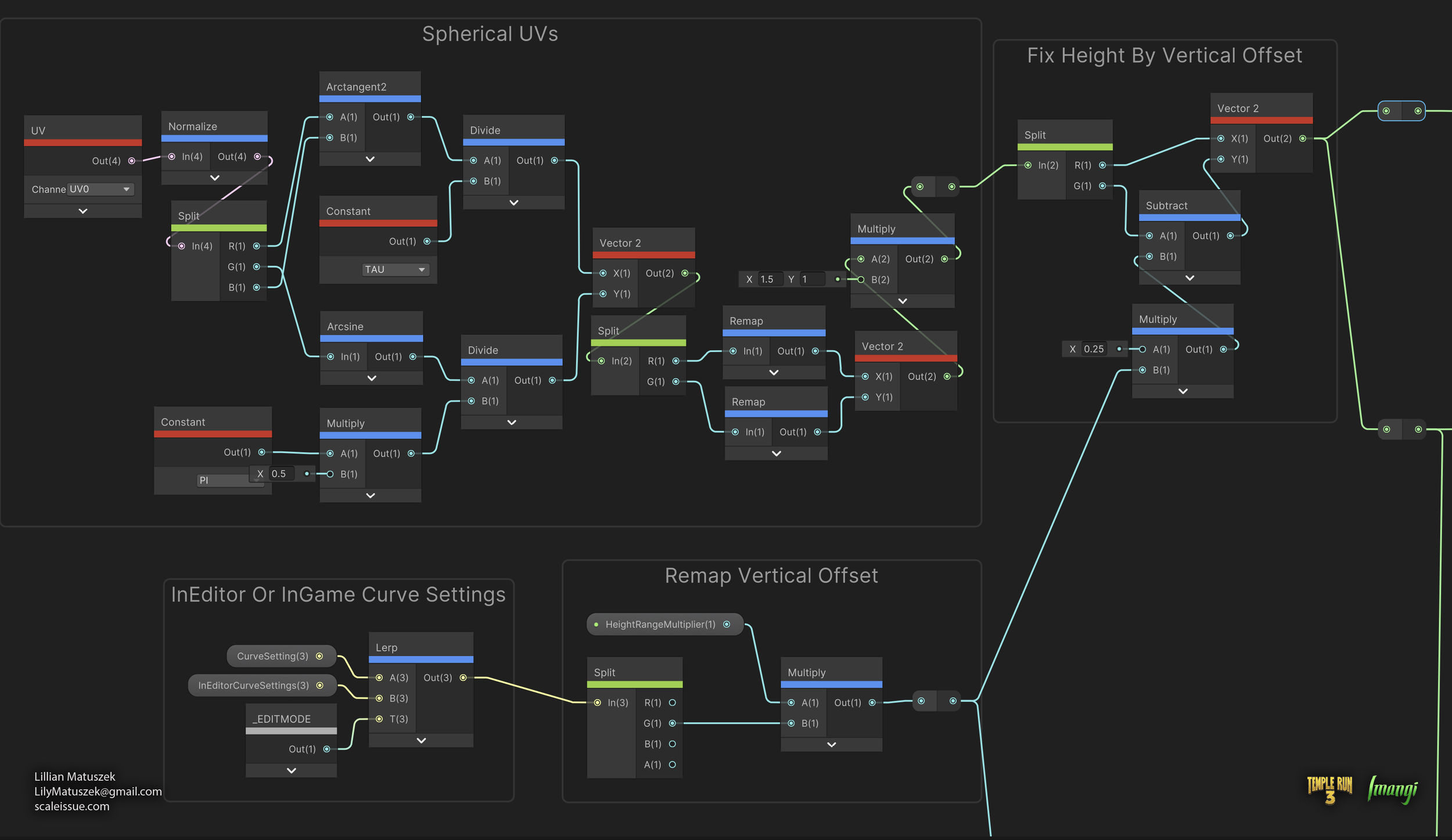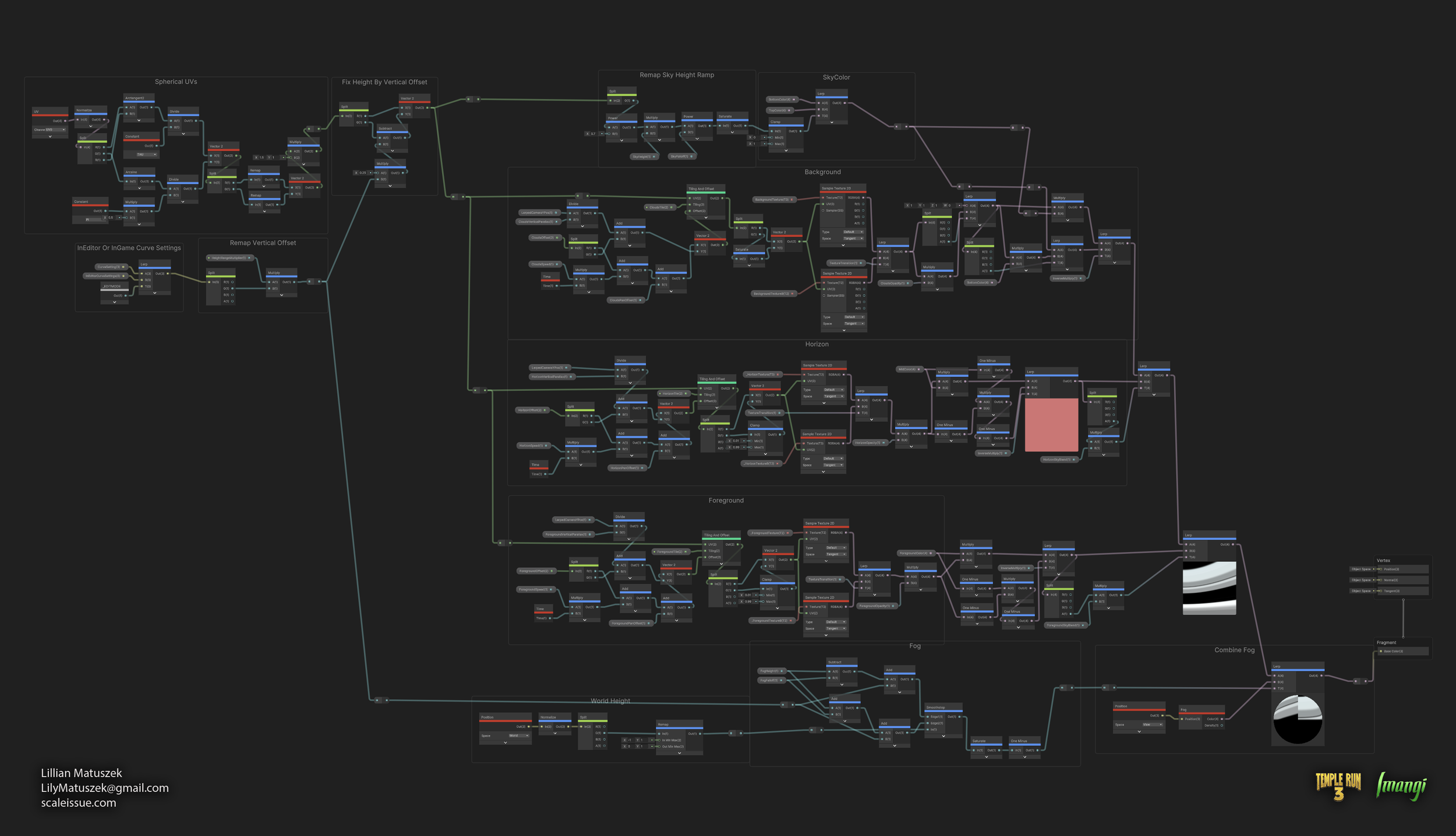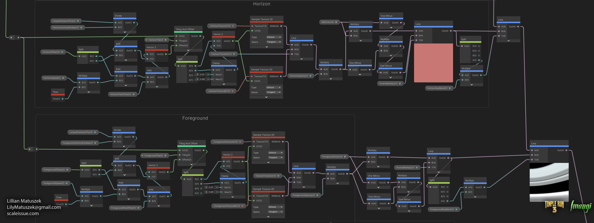 For Temple Run 3 and Temple Run: Legends, I designed a modular skybox system that supported real‑time lighting shifts and dynamic background transitions. The final implementation blended three layered textures to create a parallax effect that followed the game’s curved world geometry, and used animation curves paired with gradient‑driven color data to control time‑of‑day lighting, atmospheric depth, and environmental mood.