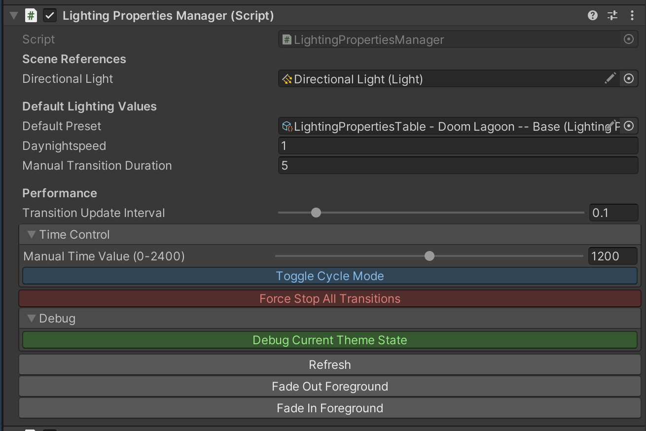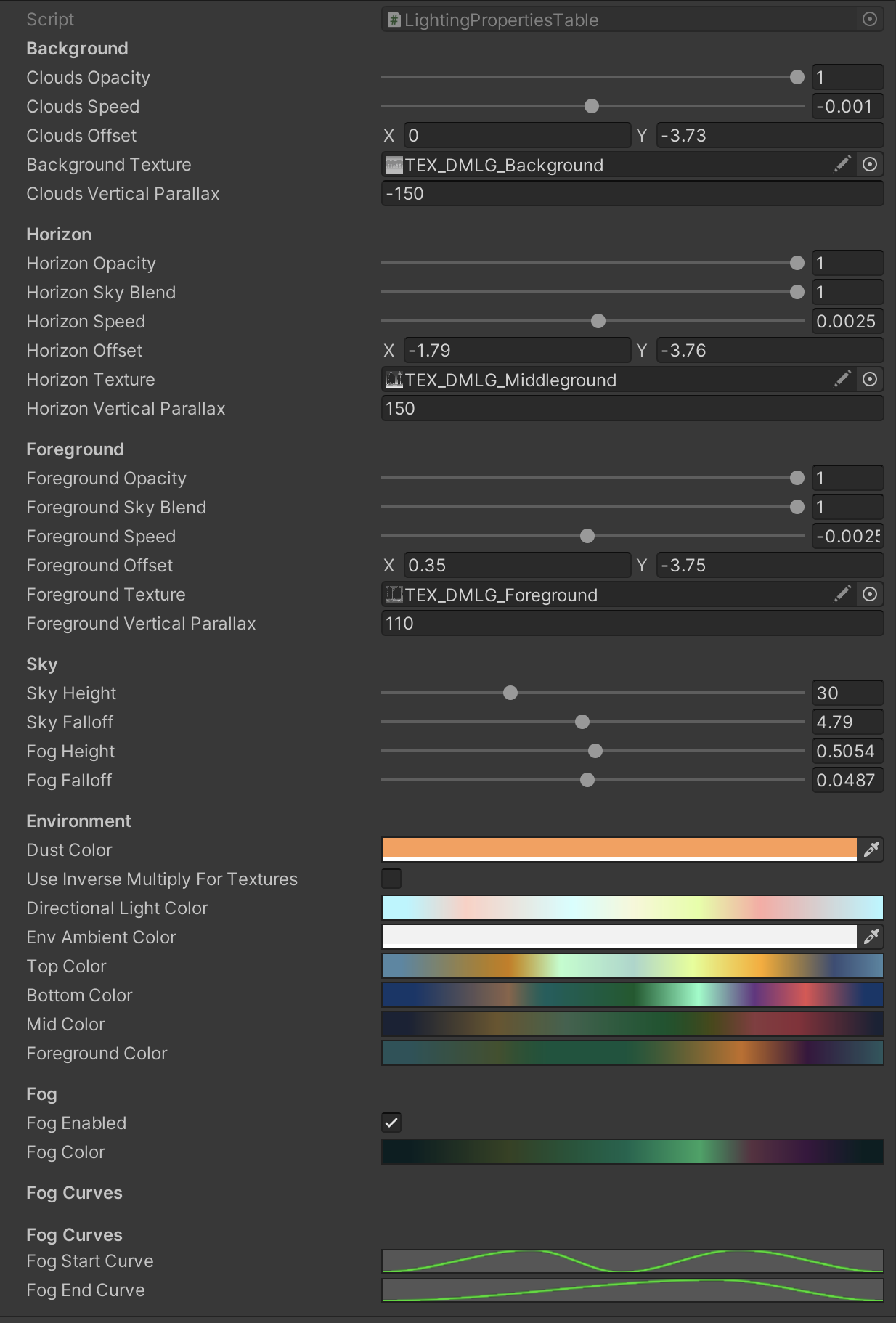 Each lighting preset is defined in a Lighting Properties Table, which exposes all sky, fog, and layer‑specific parameters in the Unity inspector. This includes: