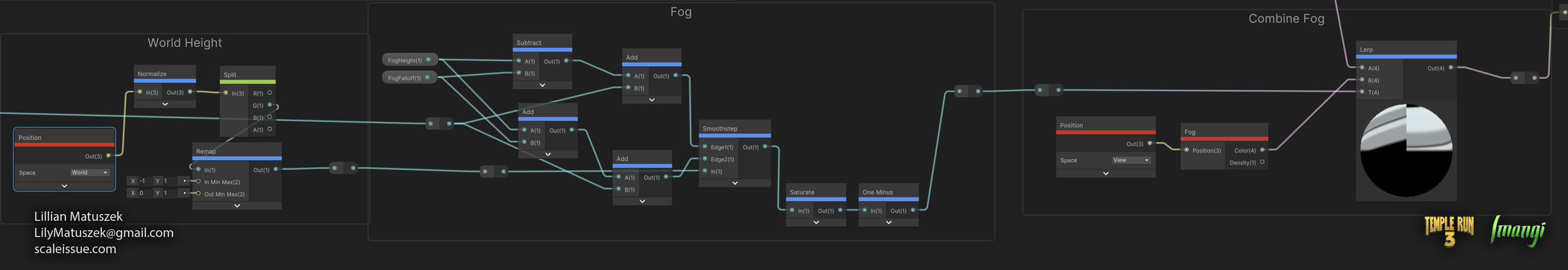 The fog block applies an exponential falloff to this height mask using Multiply, Add, and One‑Minus operations, then clamps the result to avoid overshoot on mobile hardware. This creates a fog intensity value that increases as the camera moves closer to the ground or into denser atmospheric regions. A final Lerp blends this fog value with the sky color using the same transition parameter shared across the background, horizon, and foreground layers, ensuring fog color and density remain synchronized with lighting presets and biome transitions.
