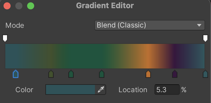 Color transitions (sky top/mid/bottom, fog color, directional light color) are authored using Unity’sgradient editor. Each gradient is evaluated over a normalized 0–1 time‑of‑day value, allowing the system to produce smooth lighting changes without branching logic in the shader.