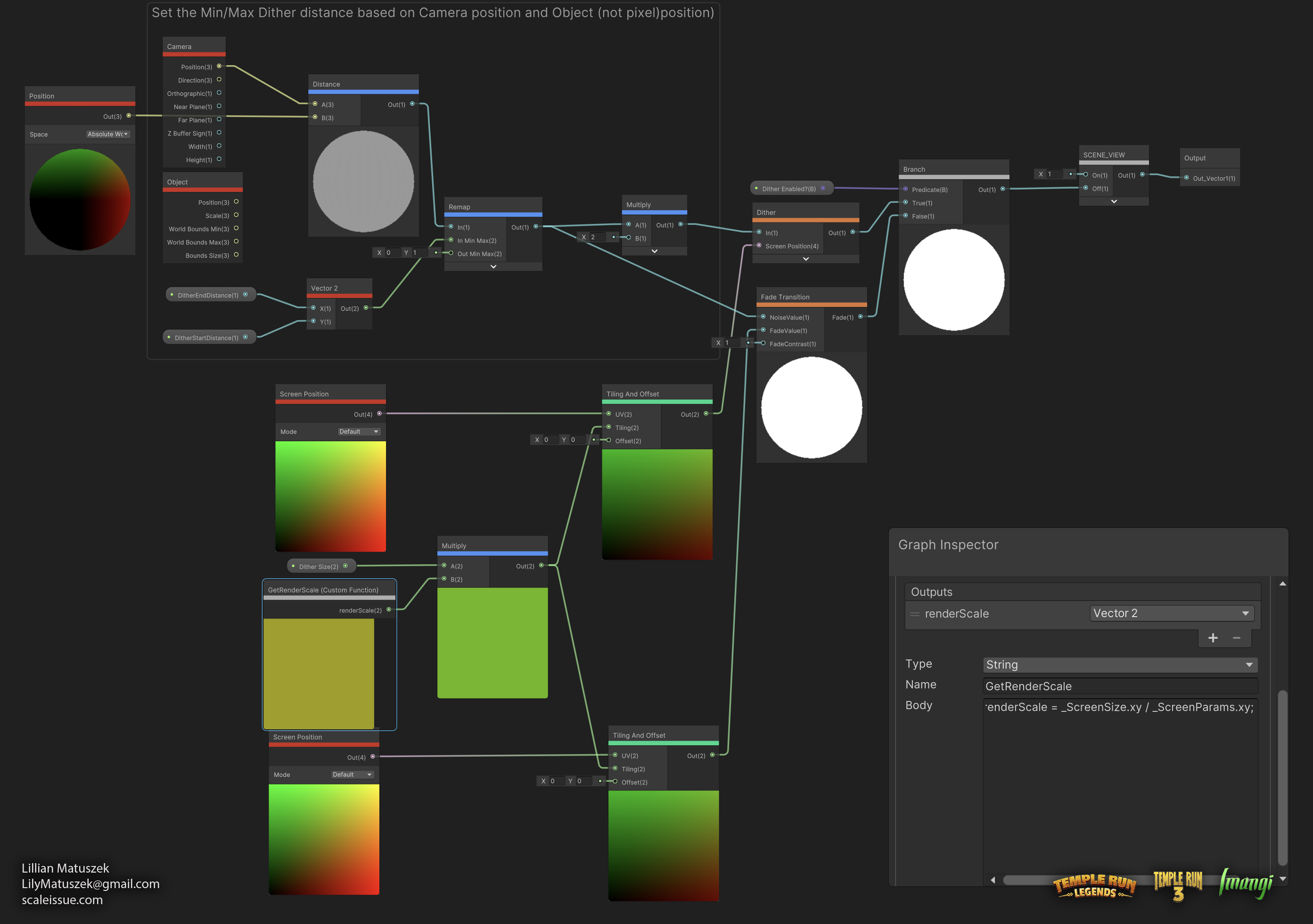 Once the fade factor is computed, it is connected to a built-in Dither node. The dithering pattern is sampled in screen space, but the fade threshold comes from world distance, so the effect feels consistent and doesn’t shimmer as the camera moves. I included a Custom Function to make the pattern scale consistent based on screen size. Finally, a branch node is used to clamp or bypass the Dither node entirely, which results in smooth fading without the dither pattern.