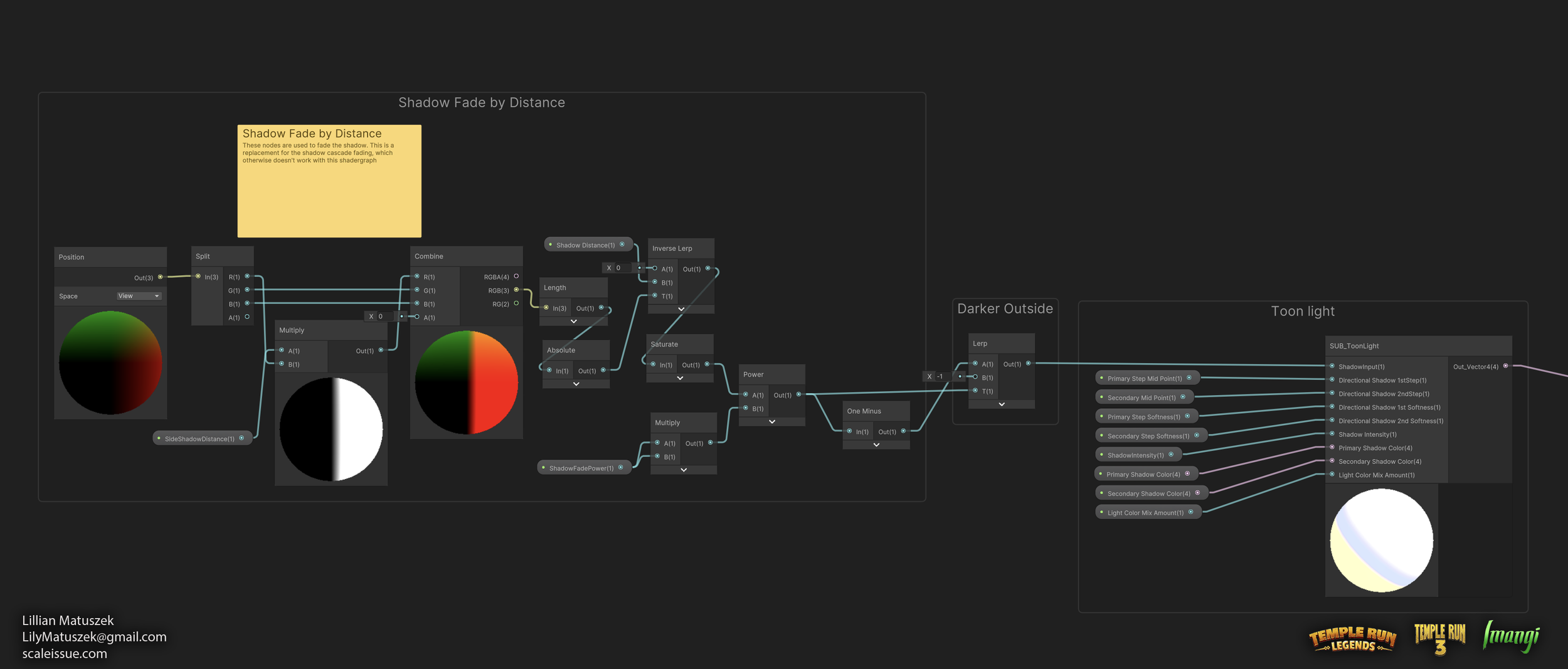 The Shadow Fade by Distance block creates an oblong mask around the player that gradually reduces light intensity as objects move farther away. It measures how far each vertex is from the camera, normalizes that distance, and shapes it into a smooth falloff curve using Inverse Lerp and a few basic math nodes.